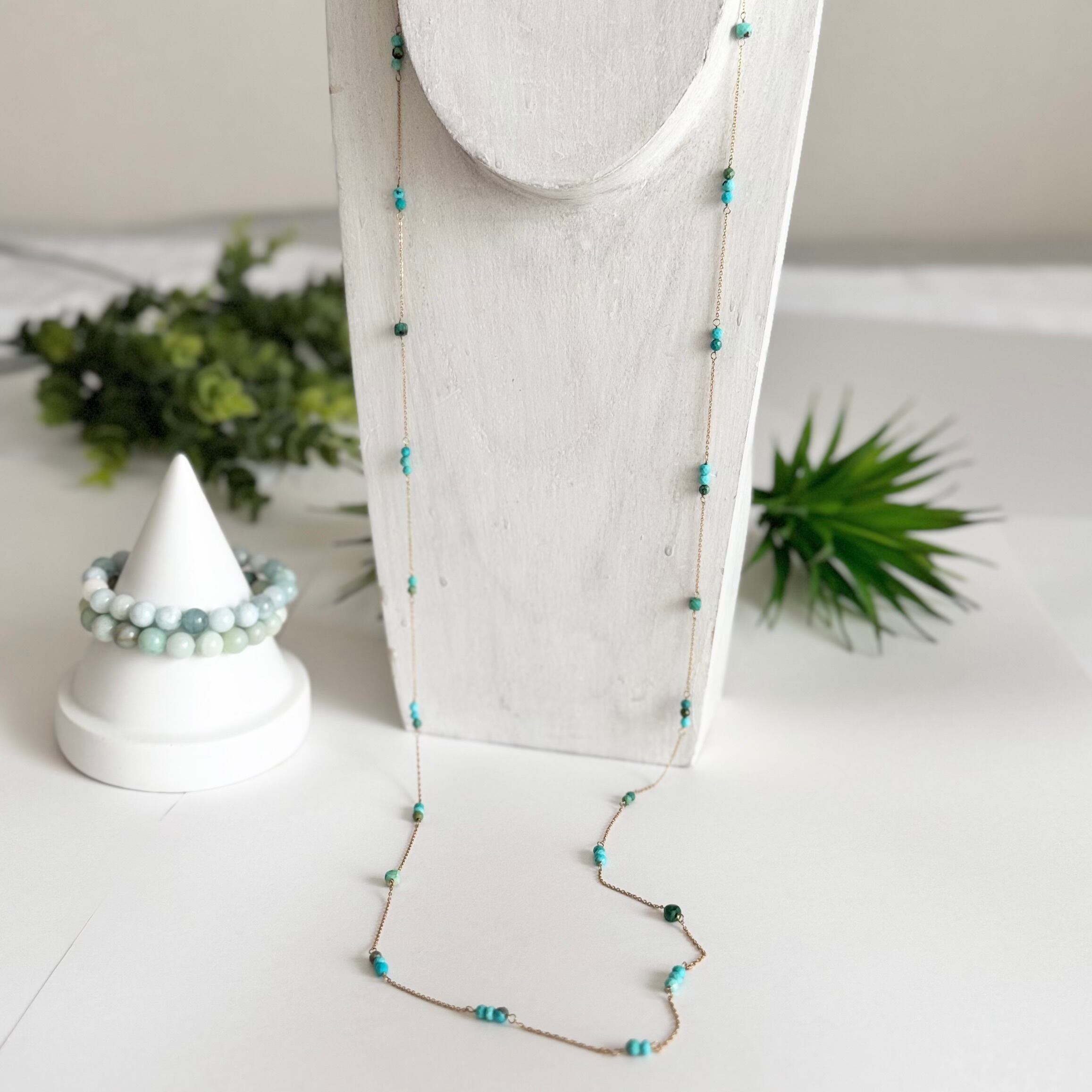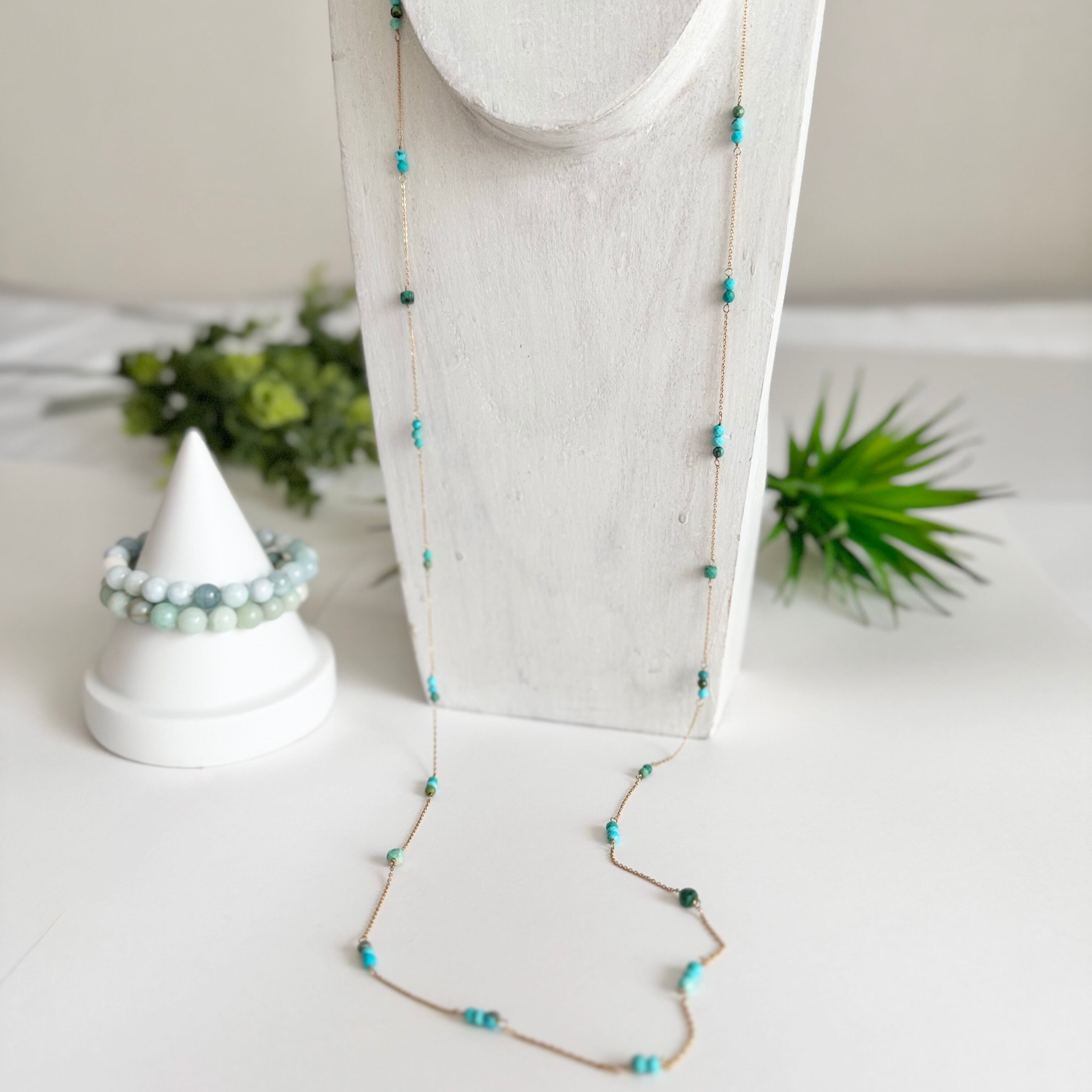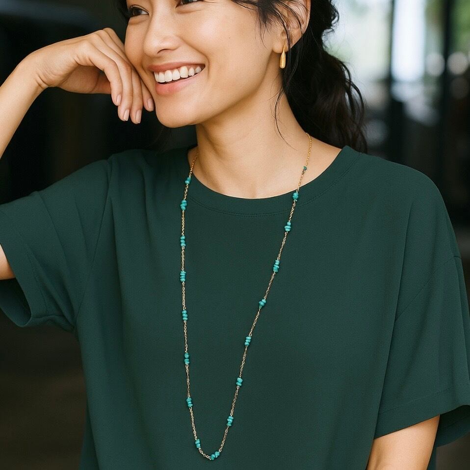 「ターコイズ」は、青緑の美しい色合いが特徴で、心の平和や安定を象徴する石とされています。100cmのロングネックレスは、コネクターなしで被るだけの手軽さが魅力。洗練されたスタイルを演出し、どんなコーディネートにも自然に馴染みます✧̣̥̇✨