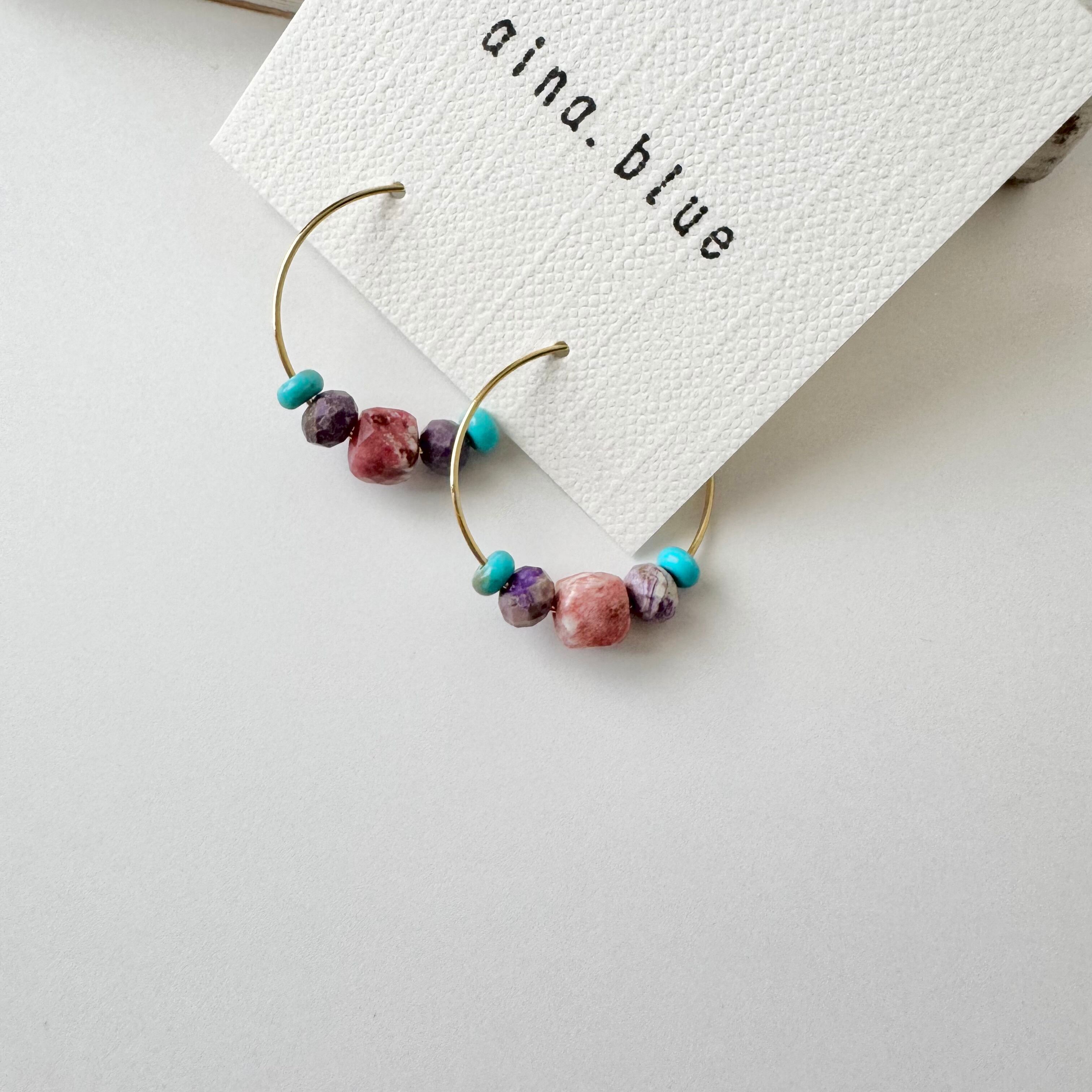 ⊹⊹ ࣪チューライト アメジストとターコイズのフープピアスは、天然石にしか出せない柔らかなそれぞれの石の色合いと風合いの組み合わせが優しい印象で顔映りの華やかなピアスですꕤ*.゚