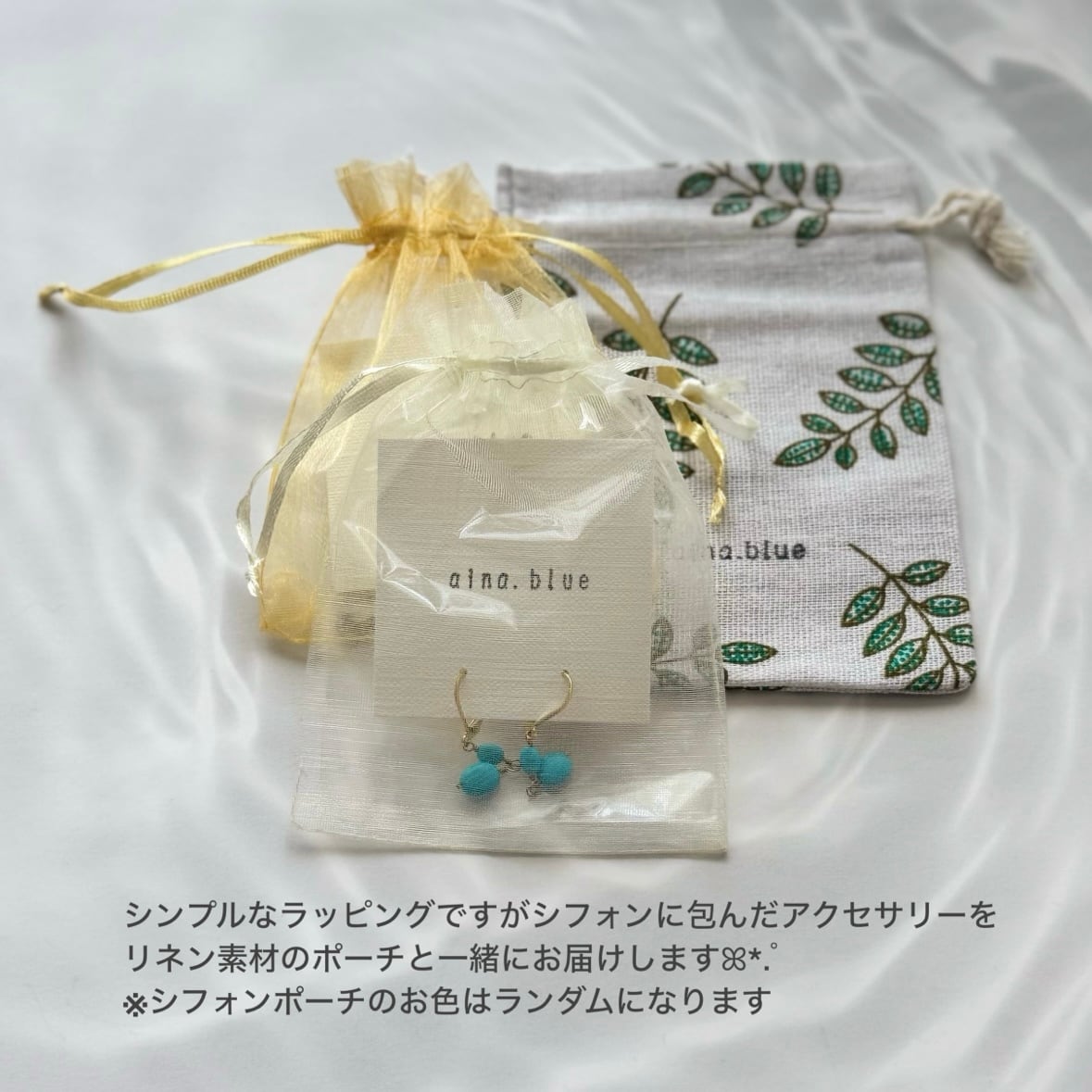 シンプルなラッピングで、シフォンに包まれたピアスをリネン素材のポーチと共にお届けしますꕤ*.゚