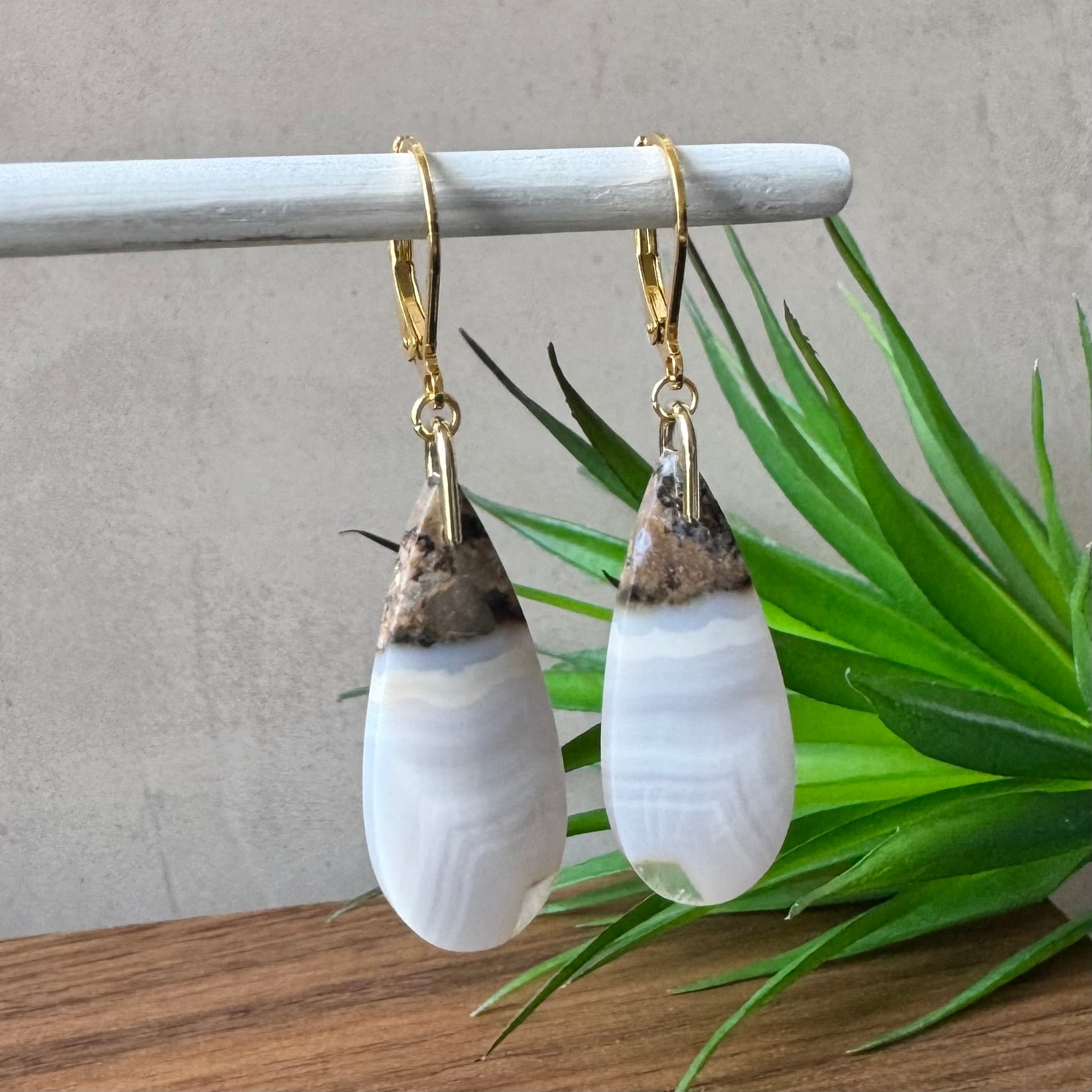 青みがかった半透明〜白色の縞模様(レース状の層)の上部には茶色の母岩部分が残っています。アゲート(めのう)の一種で、縞模様が波のように見えることから「レース」と呼ばれています。