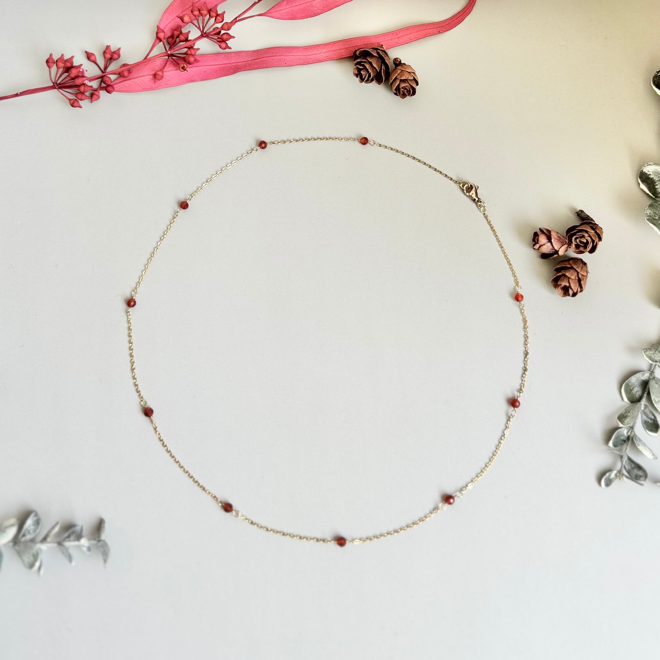 深いオレンジレッドのガーネットが定間隔に並んで首元を華やかに 後ろの襟足にも石が並んでいるので髪をアップにしても360度首筋をキレイにみせます✧̣̥̇