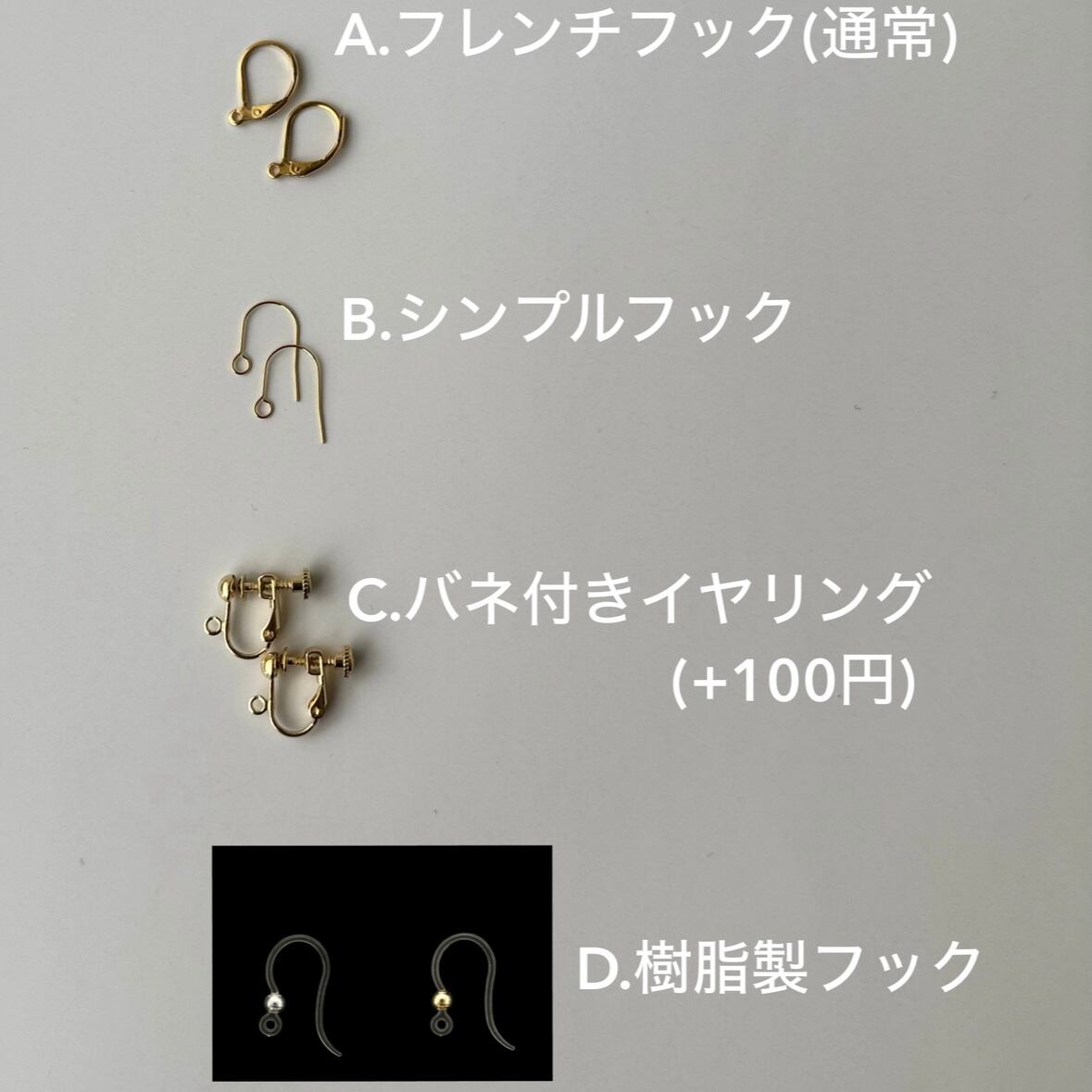 金属部分にはサージカルステンレスを使用しております。金属に敏感な方にはシルバー(メッキ加工なし)の使用をお勧めいたしますので、自分に合った素材をお選びいただけますꕤ*.゚
