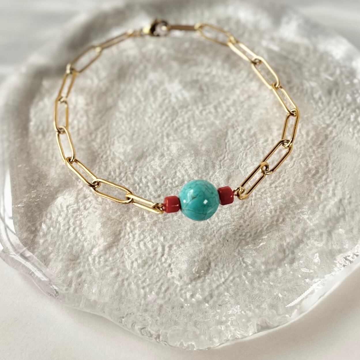 太めのチェーンに✳︎.*不揃いな形のブルーターコイズ。朱色のコーラルを差し色にビビットな印象のブレスレットに仕上げました✳︎.*✴︎*.