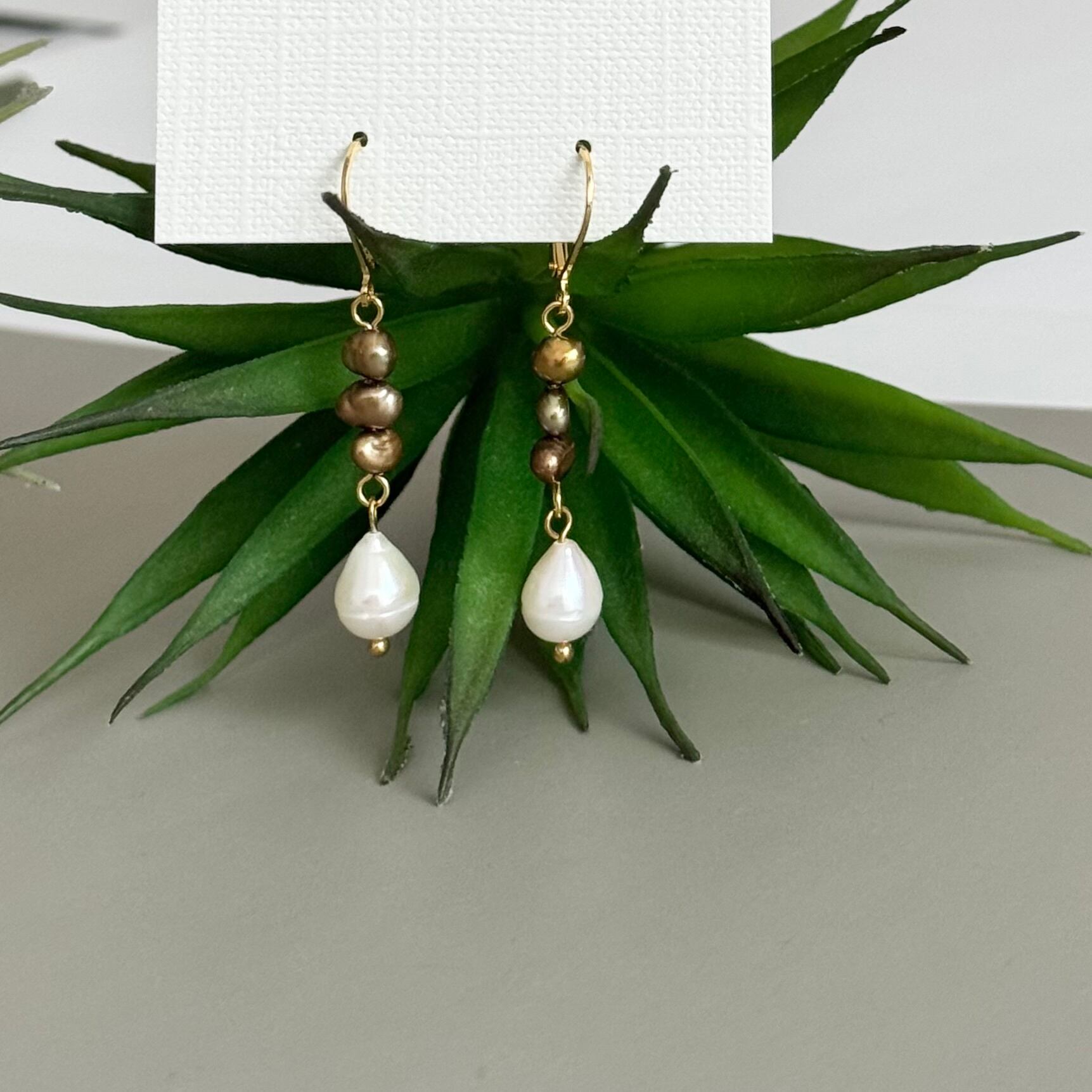 上質なホワイトカラーの淡水パールはナチュラルなドロップ形状がレアなひと粒をブロンズゴールドのパールを合わせました。